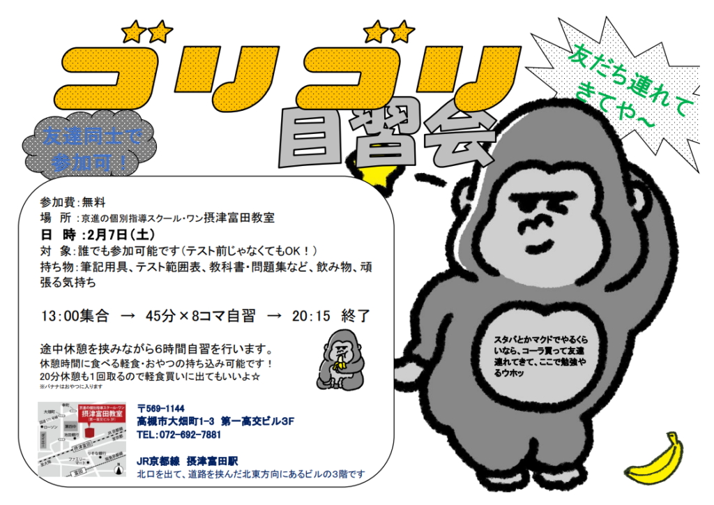 ゴリゴリ自習会はスクール・ワン摂津富田教室で定期テスト前に大好評の恒例自習室解放イベントです。