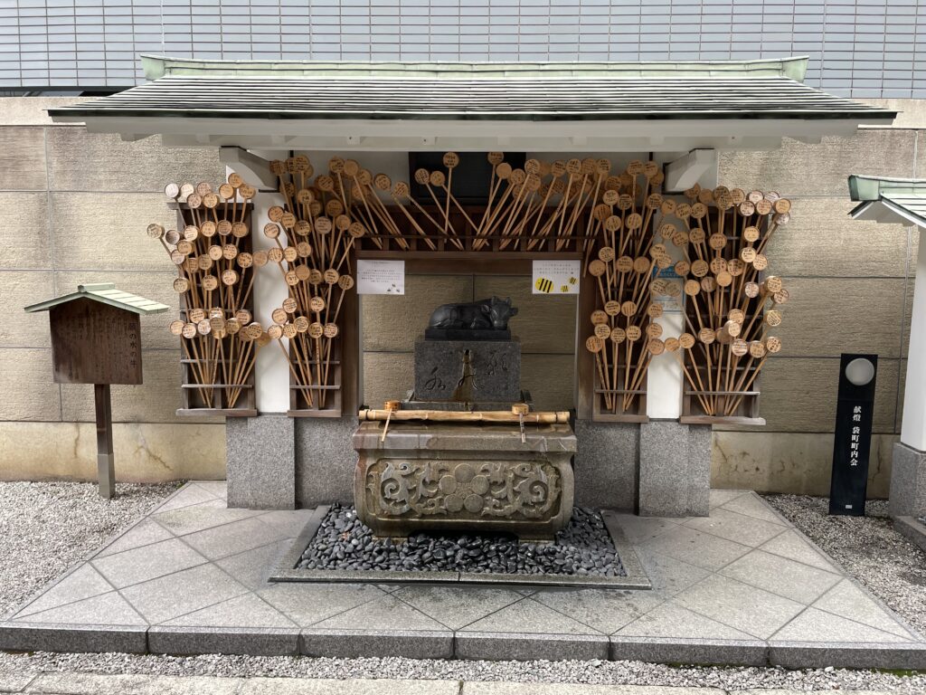 水舎の牛に自分の年の数だけ柄杓で水をかけ願い事をすると叶う。