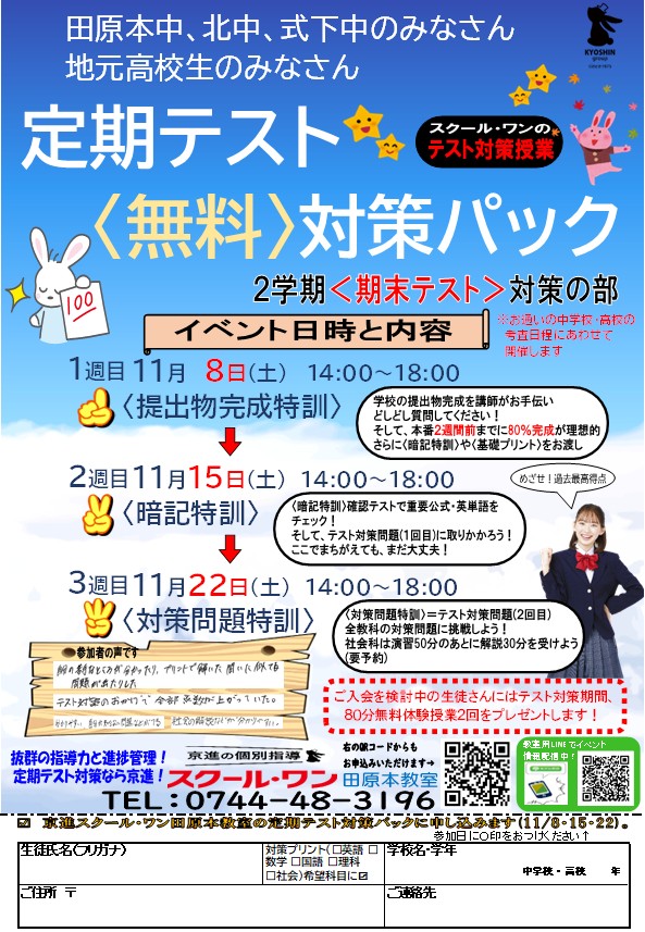 【11/8・15・22㊏】定期テスト<無料>対策パック~2学期期末テスト対策の部~のご案内 |京進|個別指導|塾|テスト対策|田原本中|北中|式下中|田原本町|三宅町|川西町