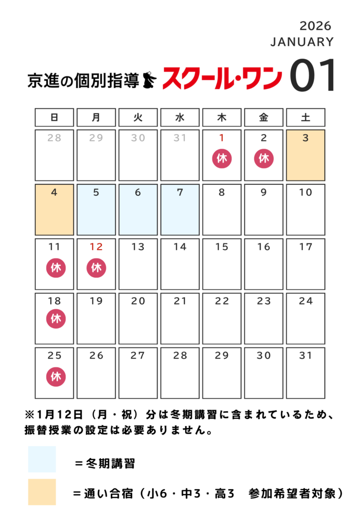 A.冬期講習期間もご都合に合わせて授業の振替が可能です。但し、お休みされる際は必ず授業開始時刻前にご連絡をお願いしております。