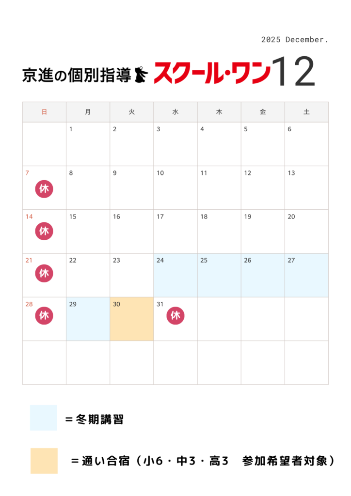 高畑教室では、2025年12月24日(水)~2026年1月7日(水)の期間で冬期講習を実施いたします。