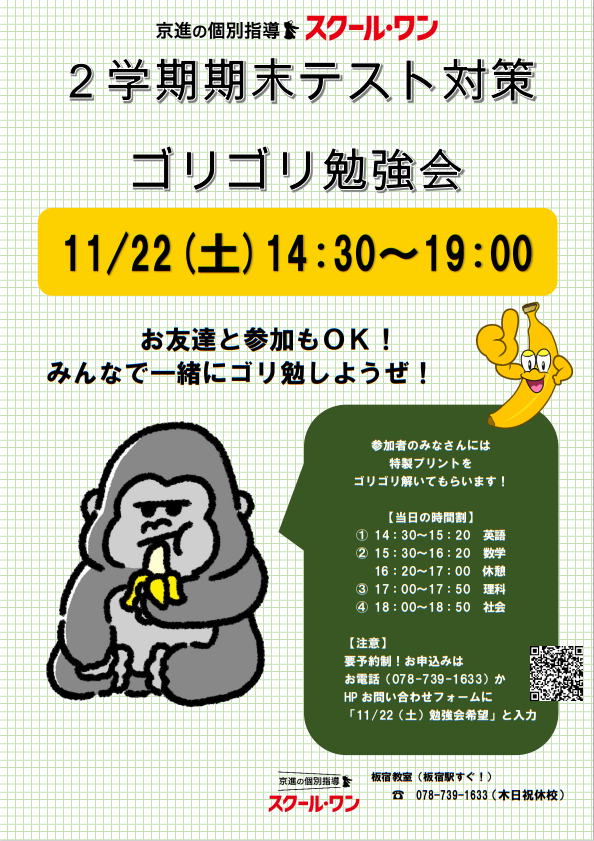 2学期期末テストに向け、スクール・ワンのテスト対策イベントを今回も開催いたします!