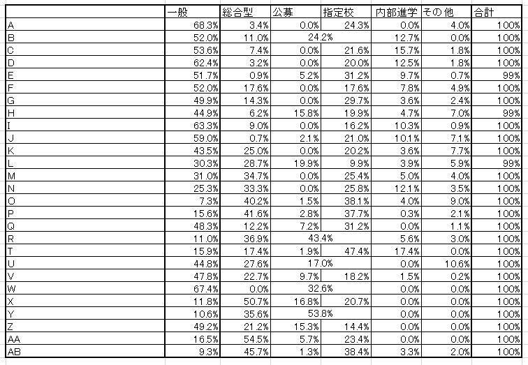 具体的な大学名は伏せますがJ以上が日東駒専、KLMがその下に位置する大学、N~Tは千葉県内の大学、U以下は千葉県内の医療系大学の受験種別入学者割合です。