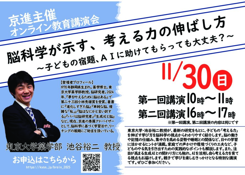 この度、京進グループでは、脳科学研究の第一人者である 東京大学 薬学部教授・池谷 裕二 氏 を講師にお迎えし、オンライン教育講演会を開催いたします。
