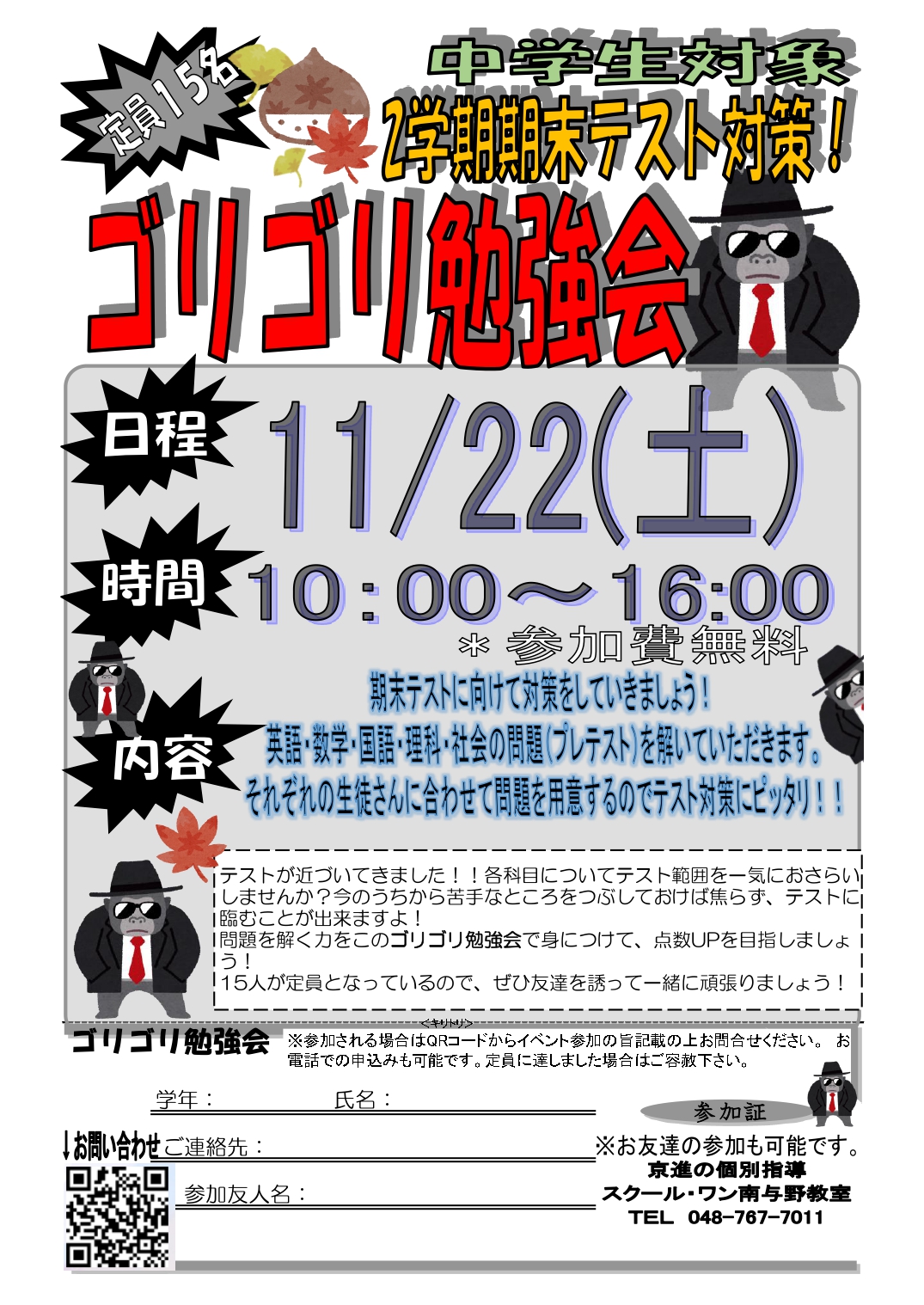 ゴリゴリ勉強会【11/22(土)10時~16時】【中学生対象】【参加費無料】【新規開校】