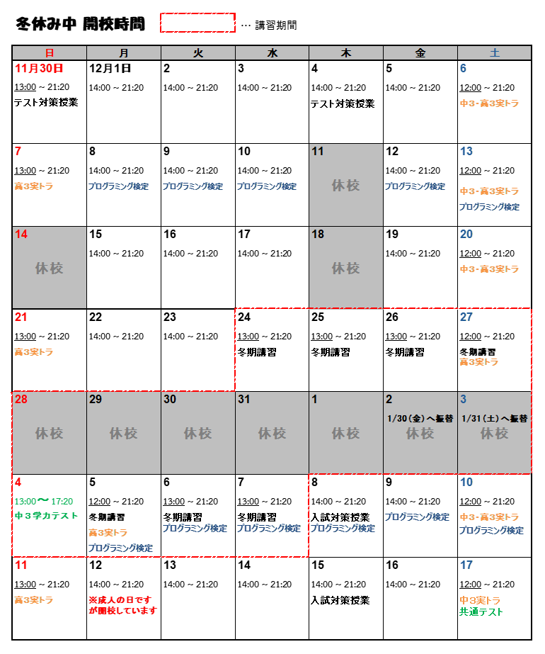 冬休み中の開校時間は以下の通りとなります。(自習室の開放時間も同様です。)