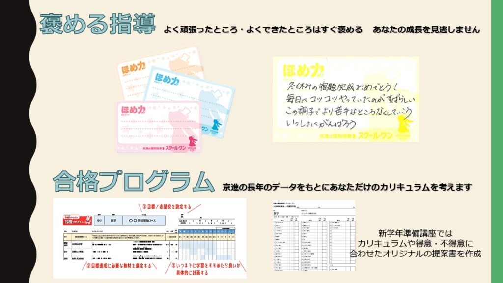 スクール・ワンでは褒める指導×合格プログラム(京進独自のカリキュラム)で