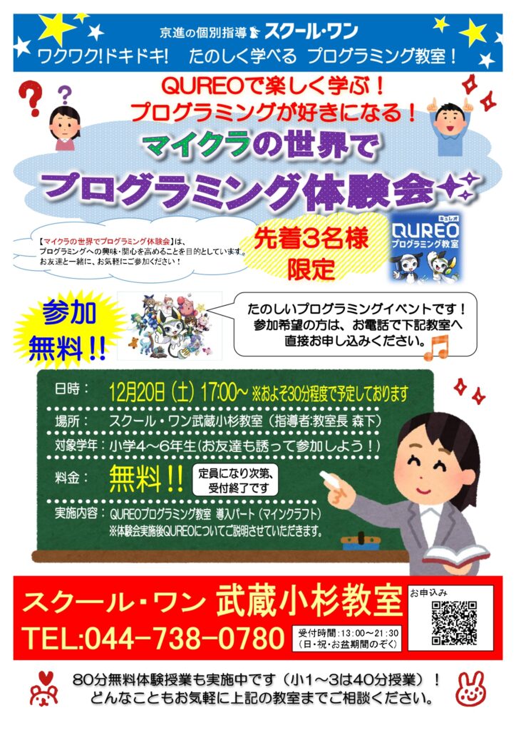 スクール・ワンではプログラミングを学べる講座として「QUREOプログラミング教室」を受講いただけます。今回のイベントでは、その導入パートであるマインクラフトの世界を体験していただきます。