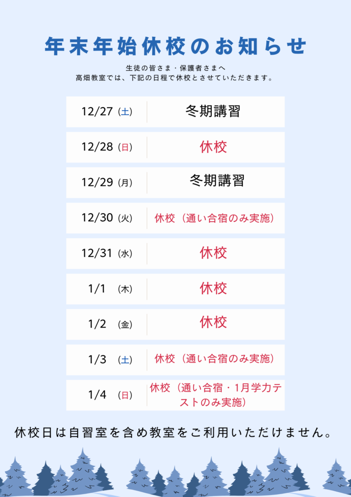 休校日は自習室を含め教室をご利用いただけません。ご確認の上ご通塾いただきますようお願い申し上げます。