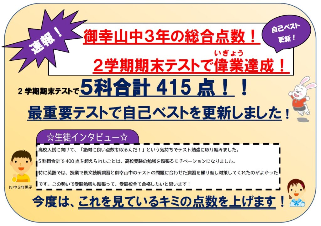 その中でも、御幸山中3年の生徒さんが5科合計415点、自己ベスト更新という素晴らしい結果を出してくれました✨