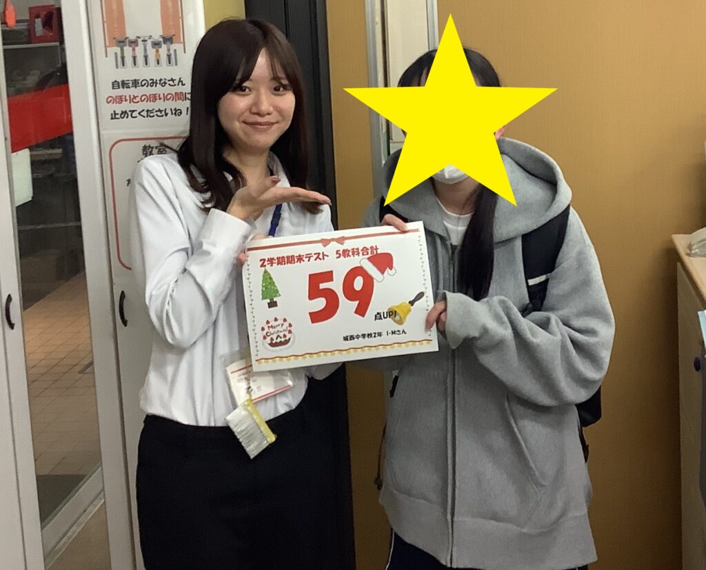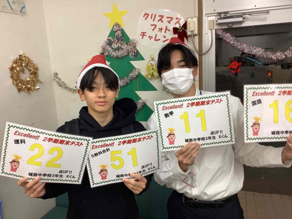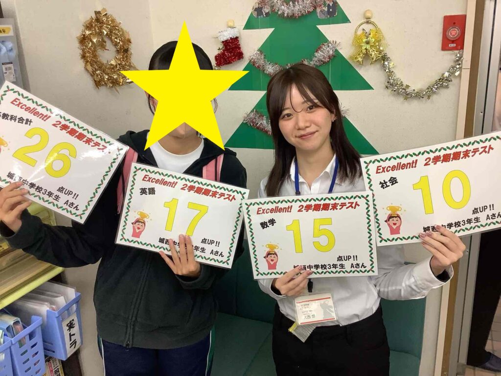 2学期期末テストでは、数学22点、理科16点UPして、5科目合計では60点UPすることができ、今までで一番高い順位・合計点になりました!学校の授業で分からなかった単元をゆっくり解説していただけて、たくさん問題を解いていくうちに、だんだん分かるようになっていき少しずつ自信がつきました!次のテストでは400点取ることを目標に頑張りたいです!