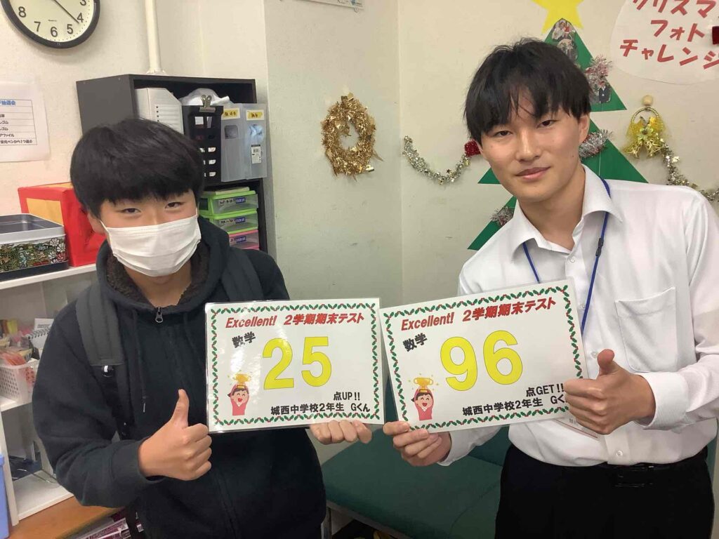 2学期期末テストの数学で前回テストから25点UPの95点をGET!関数や図形の難しい問題も分かりやすく先生に解説してもらえて、数学が以前より楽しくなりました。授業が終わった後は、自習室で1時間勉強することをルーティンにして、効率よくテスト勉強に取り組めました!