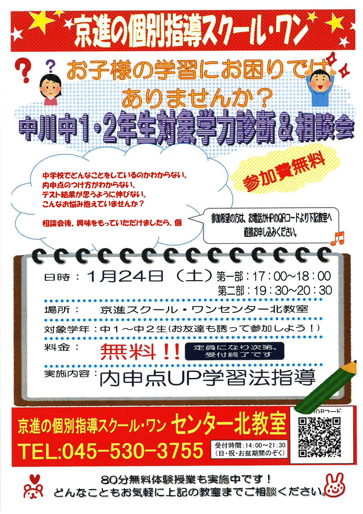 1月24日(土)開催!中川中1・2年生・保護者様対象 学力診断&相談会