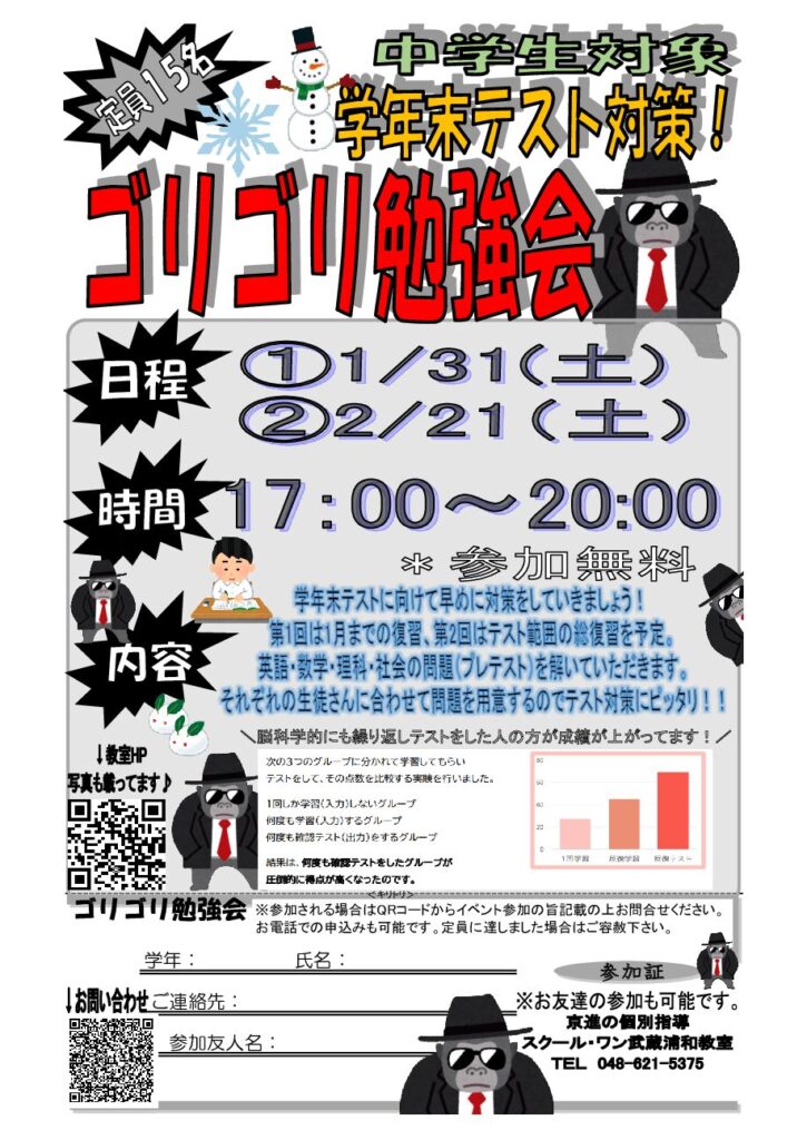 ★【中学生対象】1/31(土)2/21(土)ゴリゴリ勉強会開催★