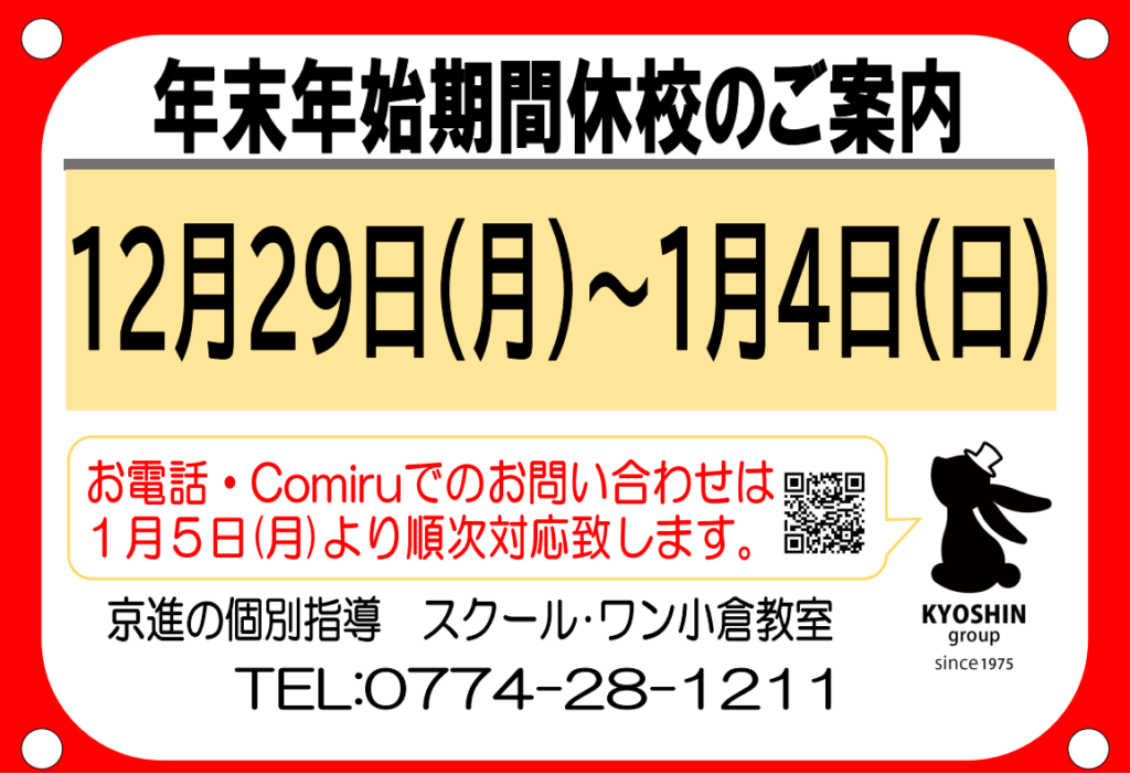 2025年12月29日(月)~2026年1月4日(日)までは年末年始休校となります。