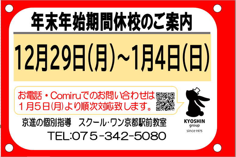 2025年12月29日(月)~2026年1月4日(日)までは年末年始休校となります。