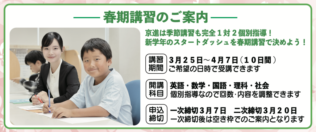 春期講習は学年別先着順ですので、詳しくは教室までお問い合わせください。