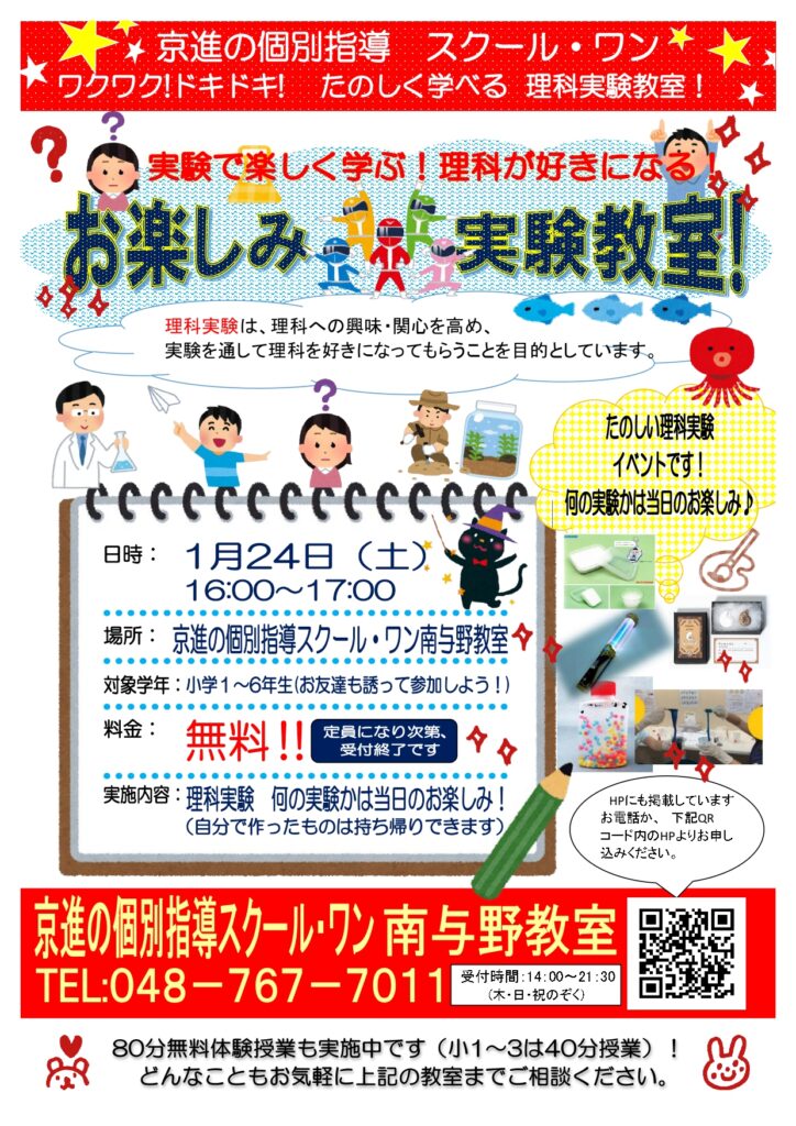 今回は1/24(土)16時~17時で理科実験イベントを行います!