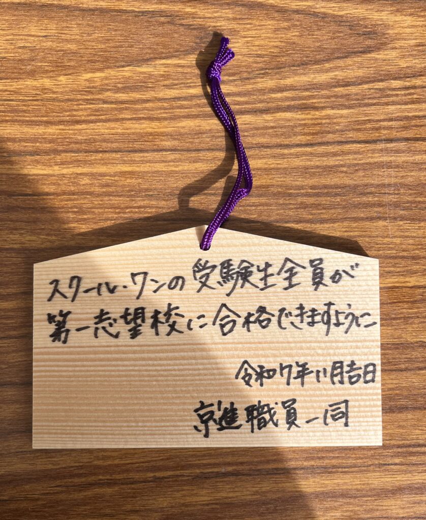 絵馬の奉納完了!「スクール・ワンの受験生が、全員合格しますように!」と祈りつつ。