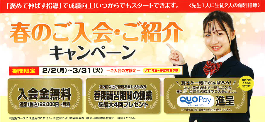 2/2(月)~3/31(火)までの早期ご入会で春期講習の授業を最大4回プレゼント🎁