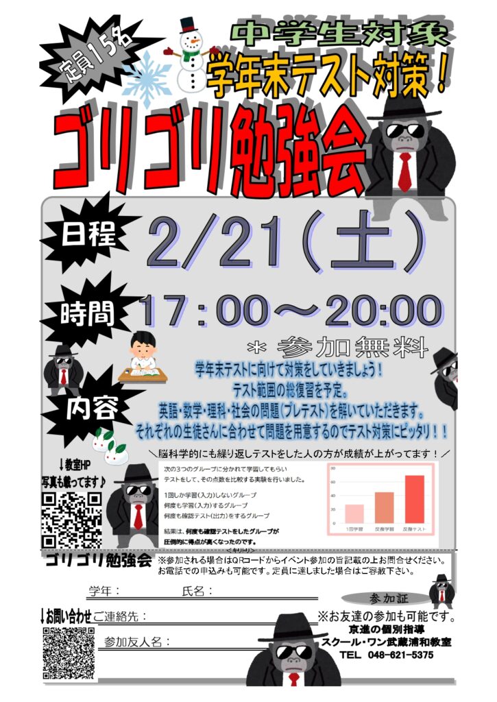 ※終了しました★【中学生対象】2/21(土)ゴリゴリ勉強会開催★