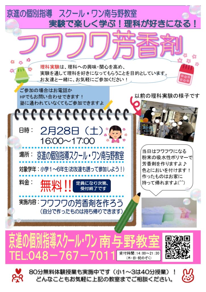 ★小学生★理科実験「フワフワ芳香剤」【2/28(土)16時~17時】【参加費無料】