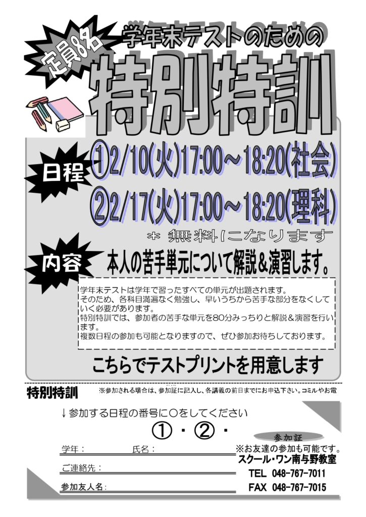 ★中学生・高校生対象★特別特訓【2/10・17(火)17時~18時20分】【参加費無料】