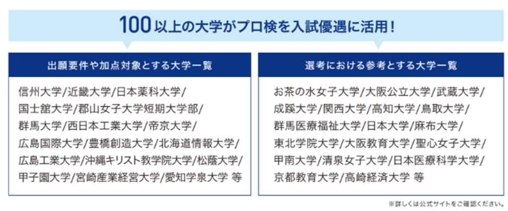 プログラミング能力検定(プロ検)は 2020年に始まった新しい検定で、2026年2月現在、全国 2,610 会場という国内最大級の会場規模で実施されている検定です。信州大や近畿大学、お茶の水女子大を始めとする100以上の大学がプロ検を入試優遇に活用するなど、注目度の高い検定試験となっています!