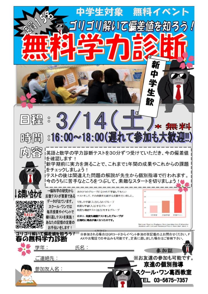 【新中学生歓迎☆中学生対象ゴリゴリ無料学力診断開催!】3月14日(土)16:00~18:00