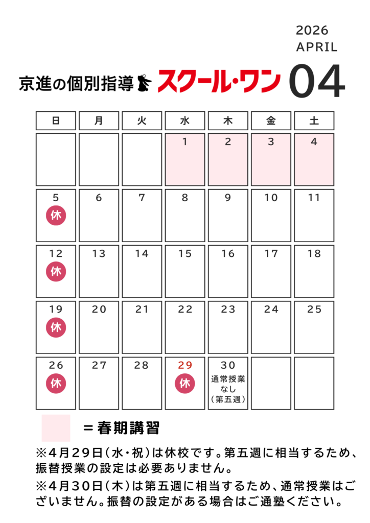 なお、4/30(木)は第五週に相当しますので、通常授業はございません。振替授業が設定されている場合のみご通塾をお願いいたします。