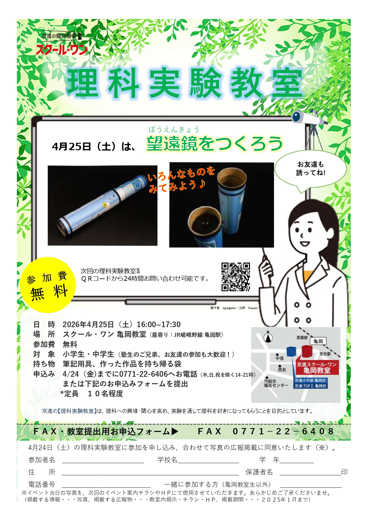 ◆4/25(土)16:00~17:30「理科実験教室」 🔭望遠鏡を作ろう!🔭