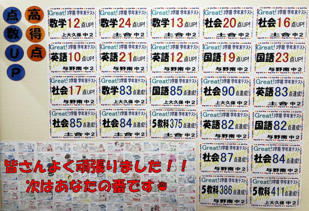 南与野教室に通っている生徒の皆様が、点数アップ👏&高得点🎉を取ることが出来ました。