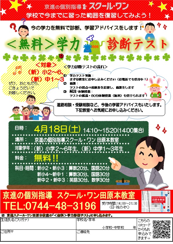 【4/18㊏14:00~】〈無料〉学力診断テストを開催します!(2026年度 第1回)