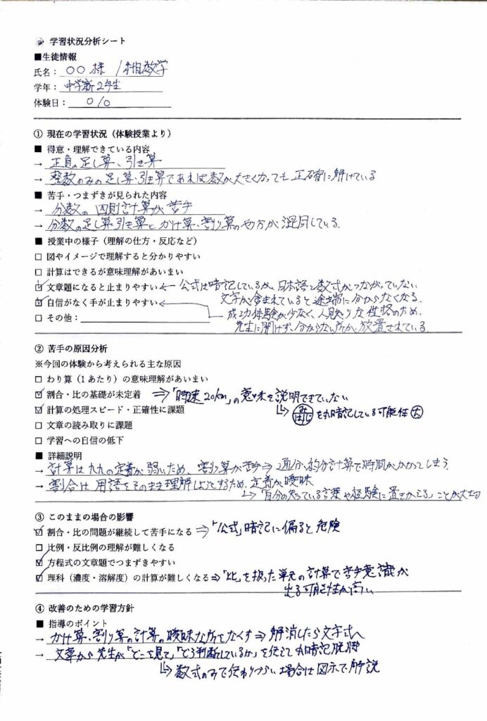 *以下の画像は実際に教室長が分析シートに記入した物です