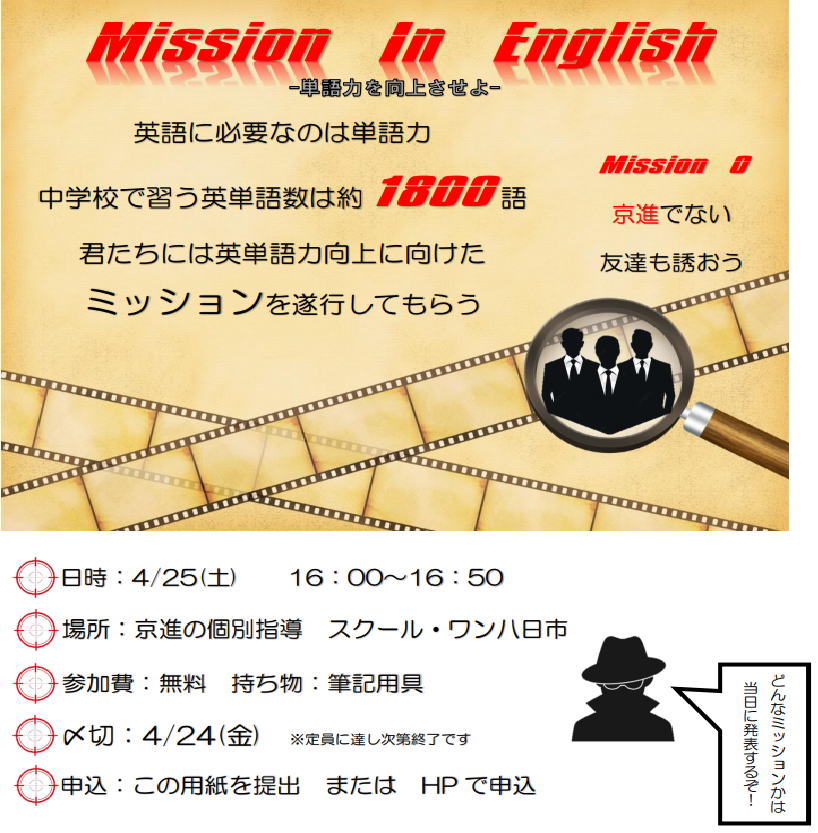 4/25㈯ 16:00~ 中3向け 「Mission In ENglish」😎