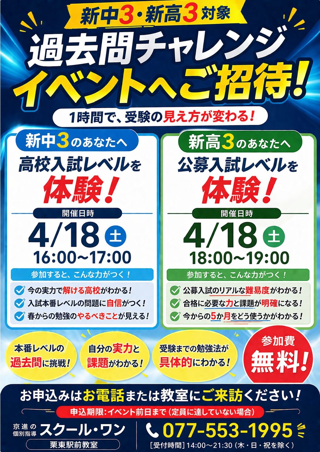 スクール・ワン栗東駅前教室では、無料の『過去問チャレンジイベント』を開催します!