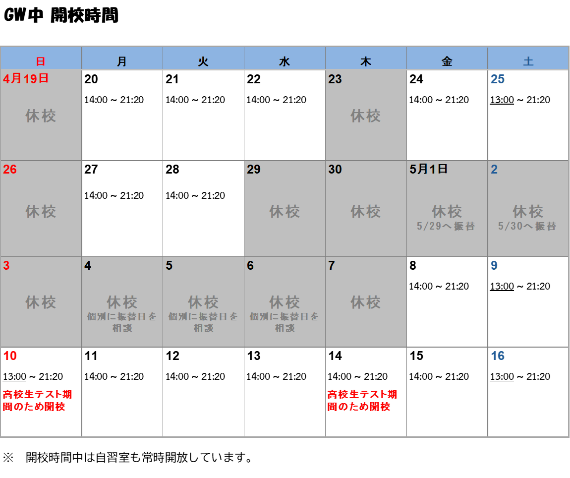 GW期間中の開校時間につきまして