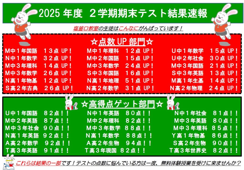 今回も塩釜口教室の生徒さんの多くが、前回定期テストよりも点数UPと高得点獲得を達成しています。
