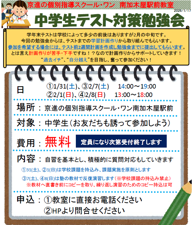 中学生テスト対策勉強会 外部生参加者募集