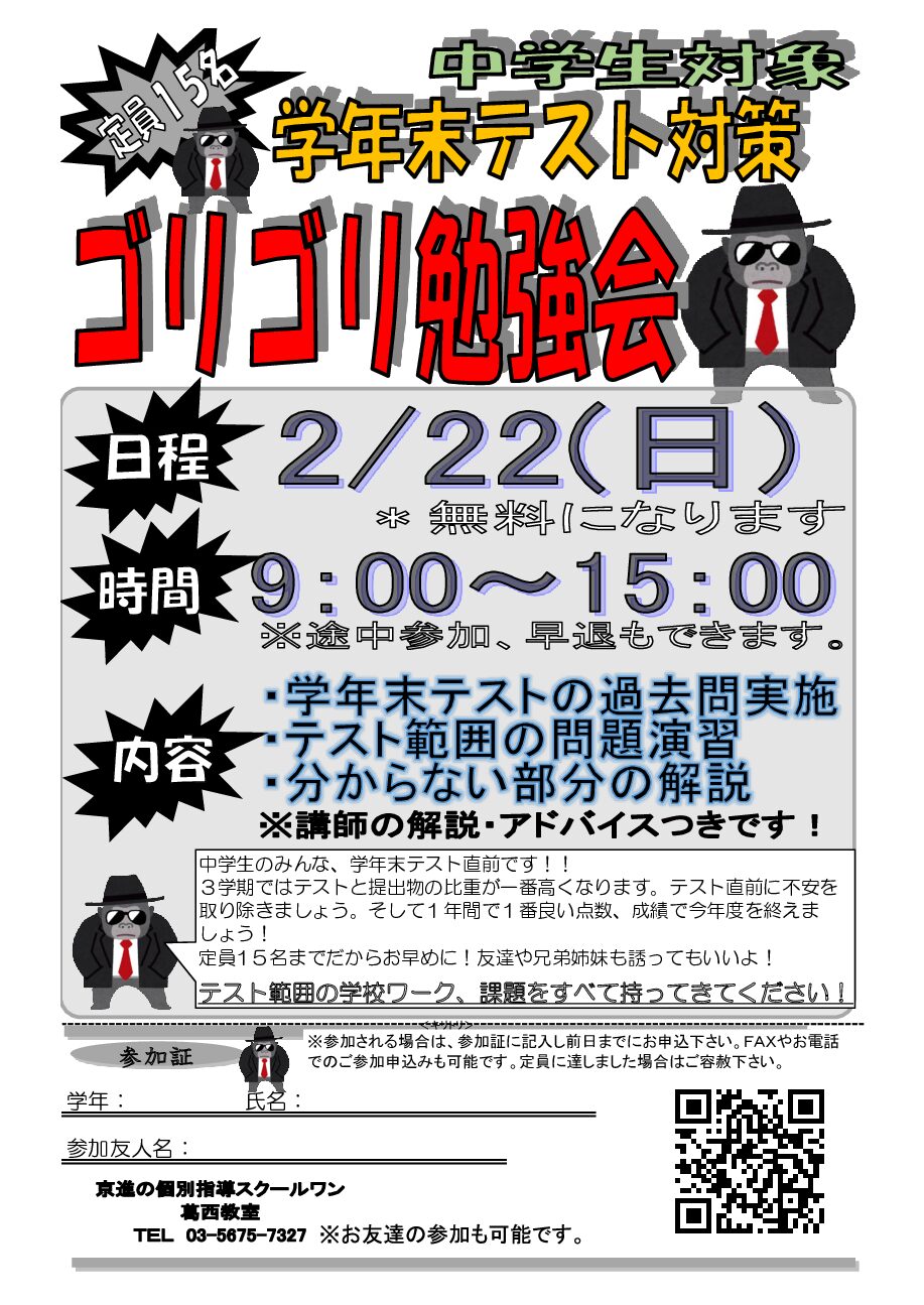 【学年末テスト対策☆ゴリゴリ勉強会開催!】2月22日(日)9:00~15:00