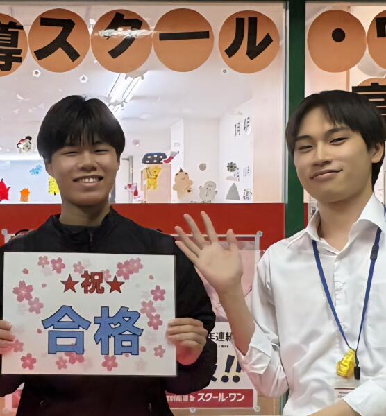 スクール・ワンでは、先生方に熱心なご指導をいただき合格までに必要な知識を教わることができました。日々の学習や定期試験、共通テスト、二次試験等に合わせて適切な授業を受けられたのでとても満足しています。その中でも、数学の解法や国語の記述の考え方を丁寧に教わったことが、一番自分の中で勉強になったと感じています。また、担当の先生以外にも、教室長や多くの先生方が、私の受験に親身になって相談に乗ってくださいました。さらに、ロビーで自習をしているときや、授業が終わったときに、先生方に「頑張ってるね」と声をかけてもらえたことは、受験期において大きな心の支えとなりました。